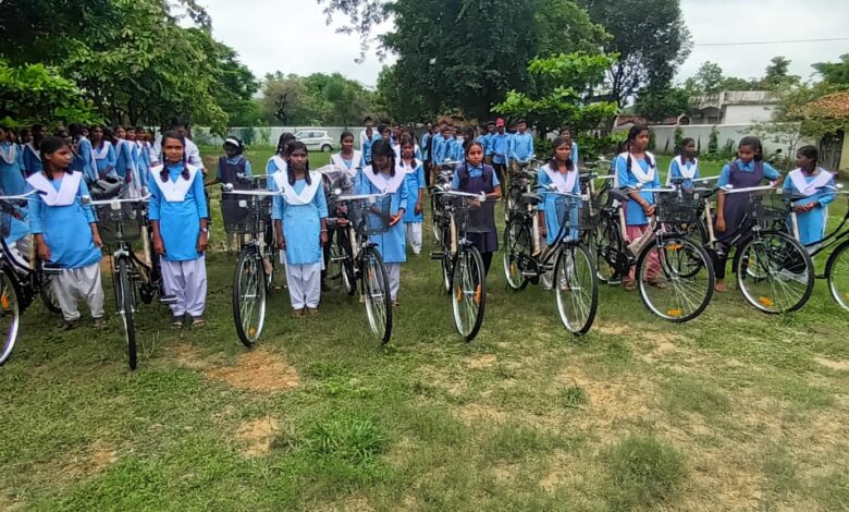 बालिका शिक्षा को समर्पित निःशुल्क सायकल वितरण योजना के तहत छात्राओं को किया गया सायकल वितरण।