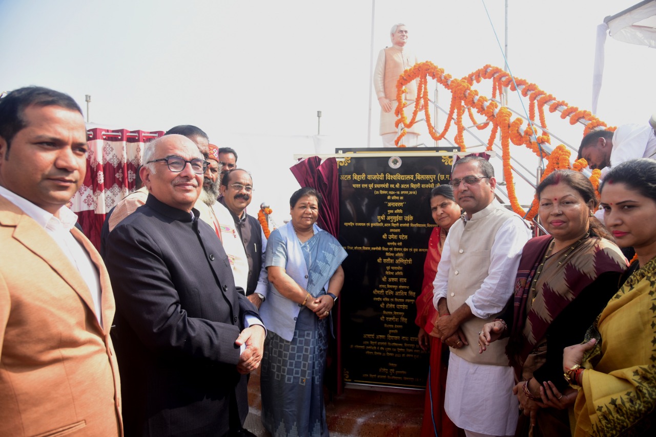 बिलासपुर, /राज्यपाल सुश्री अनुसूईया उईके आज यहां अटल बिहारी वाजपेयी विश्वविद्यालय द्वारा आयोजित तीन दिवसीय *‘कुल उत्सव’* के समापन समारोह में शामिल हुई। उन्होंने विश्वविद्यालय परिसर में पूर्व प्रधानमंत्री  अटल बिहारी वाजपेयी की आदमकद प्रतिमा का अनावरण किया। आजादी के अमृत महोत्सव के अवसर पर छत्तीसगढ़ के 75 स्वतंत्रता संग्राम सेनानियों के नामयुक्त शिलालेख का भी लोकार्पण किया। सुश्री उईके ने विश्वविद्यालय स्तर पर आयोजित छत्तीसगढ़ी खेलकूद एवं संस्कृति पर आधारित विभिन्न प्रतियोगिताओं के विजेता प्रतिभागियों को पुरस्कार एवं प्रमाण पत्र देकर सम्मानित किया। इस अवसर पर विश्वविद्यालय की त्रैमासिक पत्रिका *‘कन्हार’* के नये अंक सहित विभिन्न प्रकाशनों का विमोचन भी किया। उच्च शिक्षा मंत्री  उमेश पटेल ने वीडियो कॉन्फ्रेंसिंग के जरिए कार्यक्रम से जुड़कर समारोह की अध्यक्षता की। इस अवसर पर संसदीय सचिव श्रीमती रश्मि आशीष सिंह, सांसद  अरूण साव, पूर्व मुख्य न्यायाधीश  सतीश अग्निहोत्री, विधायक बिलासपुर  शैलेश पाण्डेय, बेलतरा विधायक श्री रजनीश सिंह एवं कुलपति आचार्य अरूण दीवाकर नाथ वाजपेयी विशेष अतिथि के रूप में उपस्थित थे।