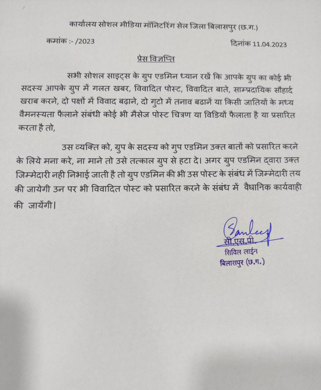 बिलासपुर पुलिस की नजर अब व्हाट्सएप ग्रुप सोशल साइट्स पर रहेगी,वैमनस्यता फैलाने,विवादित पोस्ट करने वाले के उपर हो सकती है कार्यवाही।