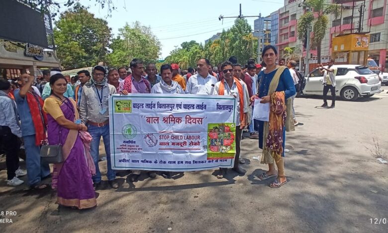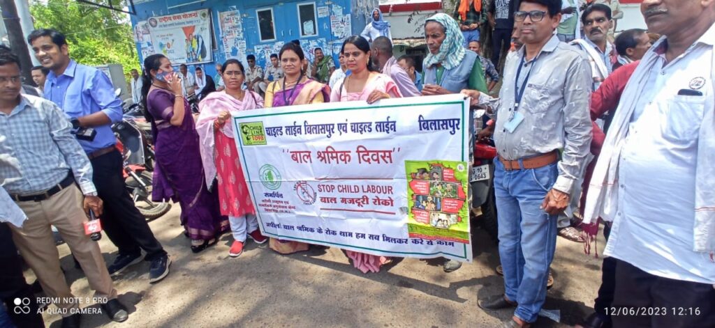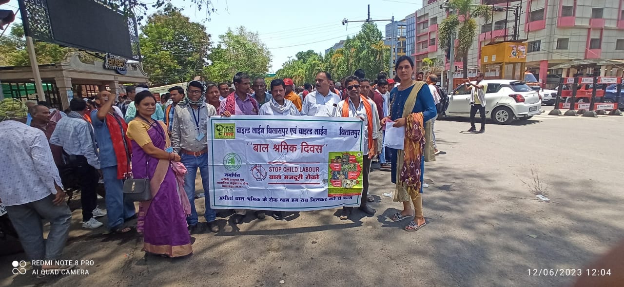 आज अन्तरराष्ट्रीय बाल श्रम निषेध दिवस के अवसर पर चाइल्डलाइन बिलासपुर द्वारा बस स्टैंड विभिन्न चौक चौराहो पर जागरूकता अभियान चलाया गया जिसमें होटल दुकान निर्माण स्थानो में बाल श्रम कानून एवं बाल श्रम निषेध का पोस्टरों को चस्पा करने लिए कहा गया एवं रैली के माध्यम से लोगो को जागरूक करने का प्रयास किया गया।बाल मजदूरी विश्व एवं भारत के लिए एक बड़ा सामाजिक मुद्दा बनता जा रहा है जिसे हल करना सरकार की नही बल्कि हर वर्ग की जिम्मेदारी है बाल श्रम बच्चो की ही नही एक सामाजिक समस्याओ का नतीजा है अगर लोगो व समाज को सही तरह शिक्षित किया जाए तो लोग समझ सकेंगे की बाल श्रम अभिशाप है किसी भी जगह बच्चे काम करते दिखे तो निशुल्क टोल फ्री नम्बर 1098 मे जानकारी देकर मदद कर सकते है। कार्यक्रम का सफल संचालन मे समर्पित संस्था के अध्यक्ष डां संदीप शर्मा संचालक नाजनीन अली केन्द्र समन्वयक पुरुषोत्तम पांडे तृप्ति दुबे नंदकुमार पांडेय धर्मेंद्र कौशिक पुष्पा बंजारे ममता क्षत्रिय प्रवीण मरकाम, मुकेश खैरवार,आदि का योगदान रहा।