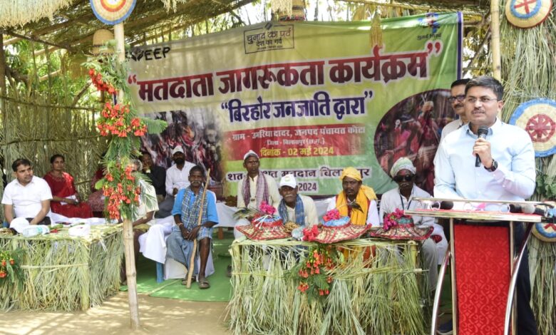 कार्यक्रम में कलेक्टर एवं जिला निर्वाचन अधिकारी श्री अवनीश शरण ने सभी को छत्तीसगढ़ी में मतदाता शपथ दिलाई। उन्होंने वरिष्ठ मतदाता, दिव्यांग मतदाता, नए मतदाता और नववधू बिरहोर वोटरों का सम्मान करते हुए 7 मई को सभी से मतदान करने की अपील की। कार्यक्रम में कलेक्टर ने भी बिरहोर आदिवासियों के साथ मांदर बजाया। उन्होंने मतदाता जागरूकता संदेश के गुब्बारे भीआसमान में छोड़े।कार्यक्रम में 22 पंचायतों से पहुंचे बिरहोर विशेष पिछड़ी जनजाति के लोगों का उत्साह देखते ही बन रहा था। महिला-पुरूषों द्वारा संयुक्त रूप से किए गए नृत्य ने समा बांध दिया। पंचायत भवन के पास कार्यक्रम स्थल को पूरी तरह से जनजातीय परिवेश में सजाया गया था। उल्लेखनीय है कि कोटा जनपद पंचायत में बिरहोर जनजाति के 104 परिवार के 336 सदस्य निवासरत हैं। बिरहोर जनजाति का यह नृत्य लोगों की बीच एकजुटता की भावना पैदा करता है। कलेक्टर एवं जिला निर्वाचन अधिकारी  अवनीश शरण को अपने बीच पाकर उनकी खुशी का ठिकाना नहीं रहा। उन्होंने अपने पारंपरिक रीति रिवाजों से खुमरी एवं महुए के हार से कलेक्टर एवं अन्य अतिथियों का स्वागत किया। इसके साथ ही उन्होंने बांस से बने कई सामग्री भी कलेक्टर को भेंट में दी। कलेक्टर ने इस अवसर पर कहा कि सुदूर वनांचल में मतदाता जागरूकता के लिए यह कार्यक्रम हो रहा है, यह सुखद क्षण हैं। उन्होंने कहा कि हम सभी को मतदान कर अपना फर्ज निभाना है। मतदान केंद्र में आना आपकी जिम्मेदारी है और मतदान अच्छे से करवाना हमारी अर्थात प्रशासन की जिम्मेदारी है। उन्होंने कहा कि मतदान केंद्र में भीषण गर्मी को देखते हुए मतदाताओं की सुविधा का पूरा ध्यान रखा जाएगा। कलेक्टर ने सभी से अनिवार्य रूप से मतदान की अपील की। कलेक्टर ने सभी को मतदाता शपथ दिलाई। सभी को मतदान करने और कराने के लिए प्रेरित किया।सीईओ जिला पंचायत  आर. पी. चौहान ने कहा कि मतदान हमारा अधिकार ही नहीं है यह हमारा कर्तव्य भी है। आज आप लोगो का जो उत्साह देखने को मिल रहा है ऐसा ही उत्साह 07 मई मतदान के दिन तक बनाए। शत प्रतिशत मतदान कर बिलासपुर का अभिमान बढ़ाए। पदमश्री  जागेश्वर यादव ने बिरहोर समाज के लोगों से अनिवार्य रूप से मतदान करने की अपील की। उन्होंने कहा कि मतदान एक उत्सव है इसमें हमें अपनी शत प्रतिशत सहभागिता निभानी है। उन्होंने कहा कि 07 मई के दिन सबसे पहले मतदान करें। पहले मतदान फिर जलपान को अपना ध्येय वाक्य बना लें।
