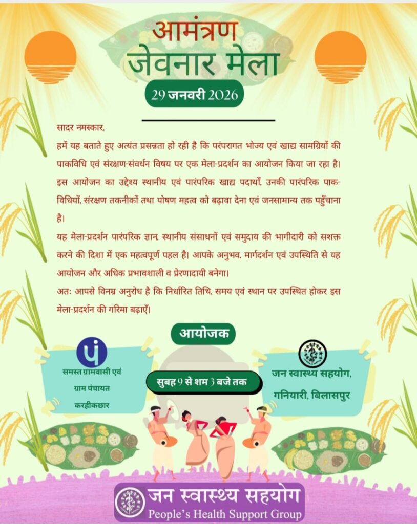 इस अवसर पर ग्राम पंचायत करही कछार में 29 जनवरी को होने वाले जेवनार मेला के बारे में विस्तार से जानकारी भी लोगों को दी गई ,29 जनवरी को होने वाले जेवनार मेले में आस पास के ग्रामीण सहित पंचायतों के लोग विभिन्न प्रकार का विलुप्त जंगलों से मिलने वाले अवषधि के रूप में मिलने वाले, कांदा व विभिन्न प्रकार का भाजी आपको खाने को मिलेंगे जिसमें सौ प्रकार का स्टॉल लगाया जाएगा जिसके बारे में चर्चा की गई। इस दौरान आस पास के लोगों को इस जेवनार मेले में पहुंचने के लिए आमंत्रित किया गया, इस दौरान ग्राम पंचायत सरपंच मुन्नी बाई जोशे लाल मिंज,उपसरपंच शिवरानी रावनटी पटेल, पंच रमेश भट्ट,अरसद अली,जमील खान,संजय यादव ,सतीश पटेल, किशन कुजीर, राम सेवक, केजऊ, अमृत मिंज, सुनीता कुजूर, संगीता श्याम, सहित जन सवास्थ्य सहयोग गनियारी से अनिल बामने, सहित महिला समूह के सदस्य व पदाधिकारी मौजूद रहे।