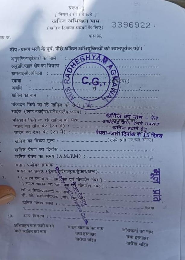 अब जरा खनिज अधिकारी भी अपने विभाग से जारी रायल्टी पर्ची पर एक नजर डालें और देखे की उनके द्वारा आनन फानन में जारी की गई रायल्टी पर्ची का कैसे दुरुपयोग किया जा रहा है। अवधि निकल जाने के बाद भी पर्ची का उपयोग वह भी कोरा अपने आप में खनिज अधिकारियों की कार्यप्रणाली पर सवालिया निशान खड़े करता नजर आता है।