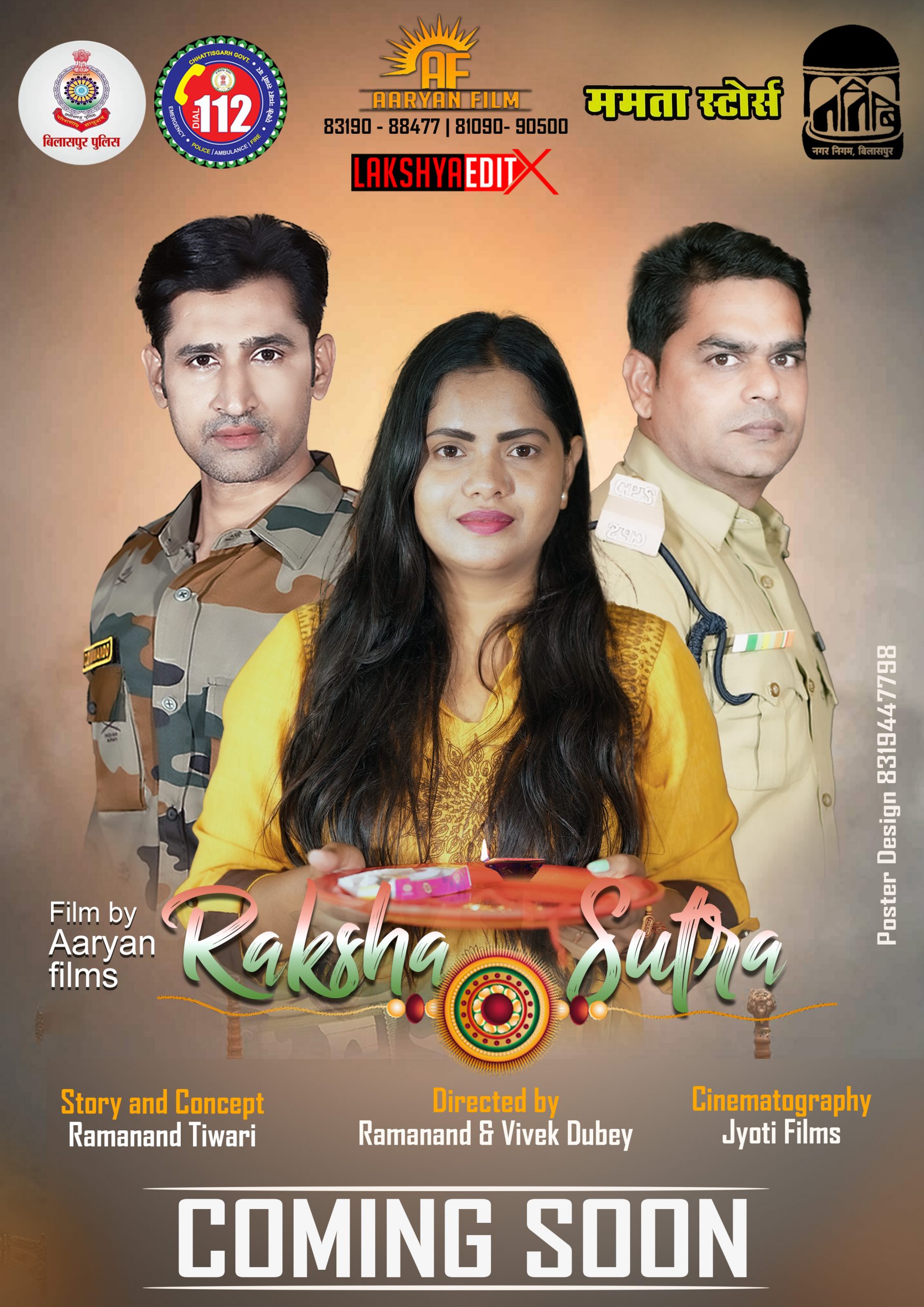 बिलासपुर। रक्षाबंधन के अवसर पर आर्यन फिल्म्स के द्वारा पुलिस व फौजी भाइयों के लिए एक विशेष उपहार के तौर पर शार्ट फिल्म रक्षा सूत्र का निर्माण किया गया है जिसका पोस्टर विमोचन बिलासपुर नगर निगम कमिश्नर अजय कुमार त्रिपाठी के द्वारा किया गया आपको बता दें कि इस फिल्म में मुख्य भूमिका छत्तीसगढ़ के जाने-माने अभिनेता अखिलेश पांडे,विवेक दुबे व सीमा वर्मा ने निभाई है इनके अलावा इस फिल्म में नेगेटिव रोल में संजय यादव,वीनू क्रॉक्स,मनमोहन पात्रे, प्रभात,ओम आदी कलाकारों ने भी महती भूमिका निभाई है इस फिल्म का निर्देशन आर्यन तिवारी के द्वारा किया गया है यह फिल्म समाज को संदेश देने के लिए बनाई गई है जिसमें की पुलिस के द्वारा समाज मे किए गए कार्यों को प्रदर्शित किया गया है और दिखाया गया है कि कैसे पुलिस समाज के प्रति समर्पित रहती है और अपनी जान की बाजी लगाकर भी लोगों की रक्षा करती है पोस्टर को लांच करते हुए कमिश्नर अजय कुमार त्रिपाठी ने पोस्टर की तारीफ की और कहा कि इसी तरह समाज को संदेश देने वाली फिल्में बनती रहनी चाहिए जिससे कि समाज और पुलिस में सामंजस्य बनी रहे।